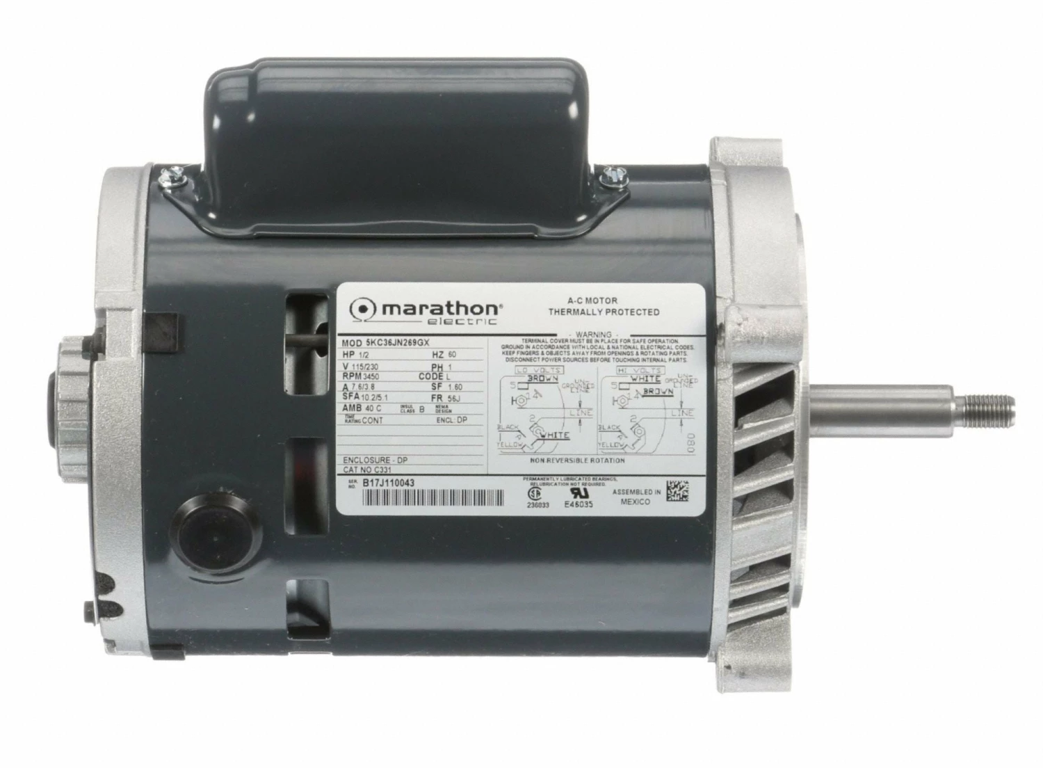 Marathon Motors 1/2 HP Jet Pump Motor, Capacitor-Start, 3450 Nameplate RPM, 115/208-230 Voltage, 56J Frame – 5KC36JN269X