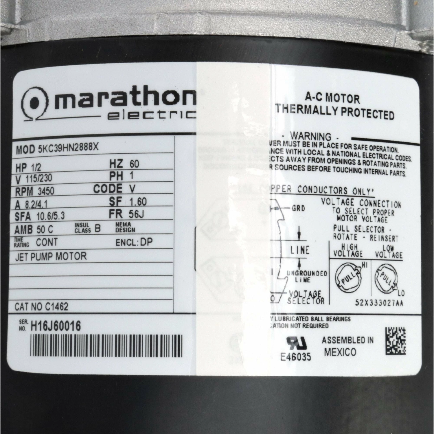 Marathon Motors 1/2 HP Jet Pump Motor, Capacitor-Start, 3450 Nameplate RPM, 115/230 Voltage, 56J Frame – 5KC39HN2888X