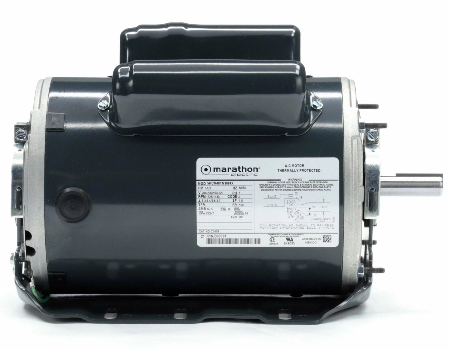 Marathon Motors 1/3, 1 HP, General Purpose Motor, Capacitor-Start/Run, 1725/1140 Nameplate RPM, 208-230 Voltage – 5KCR48TN3084X