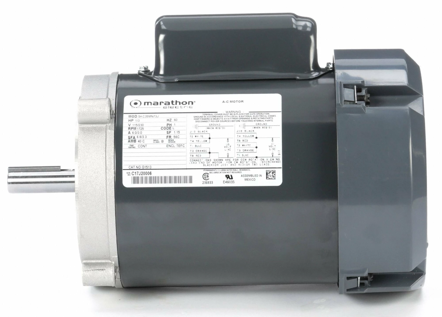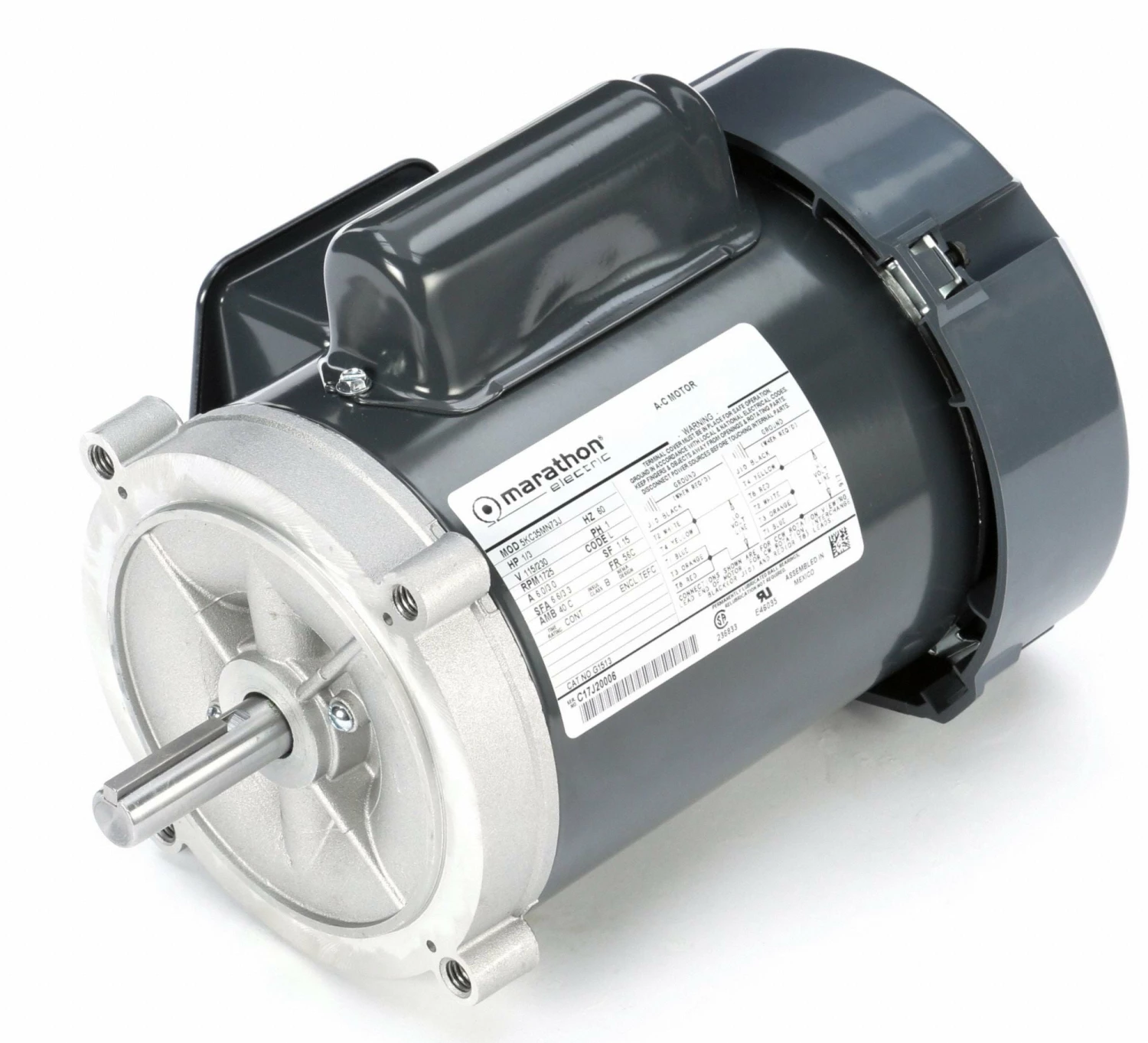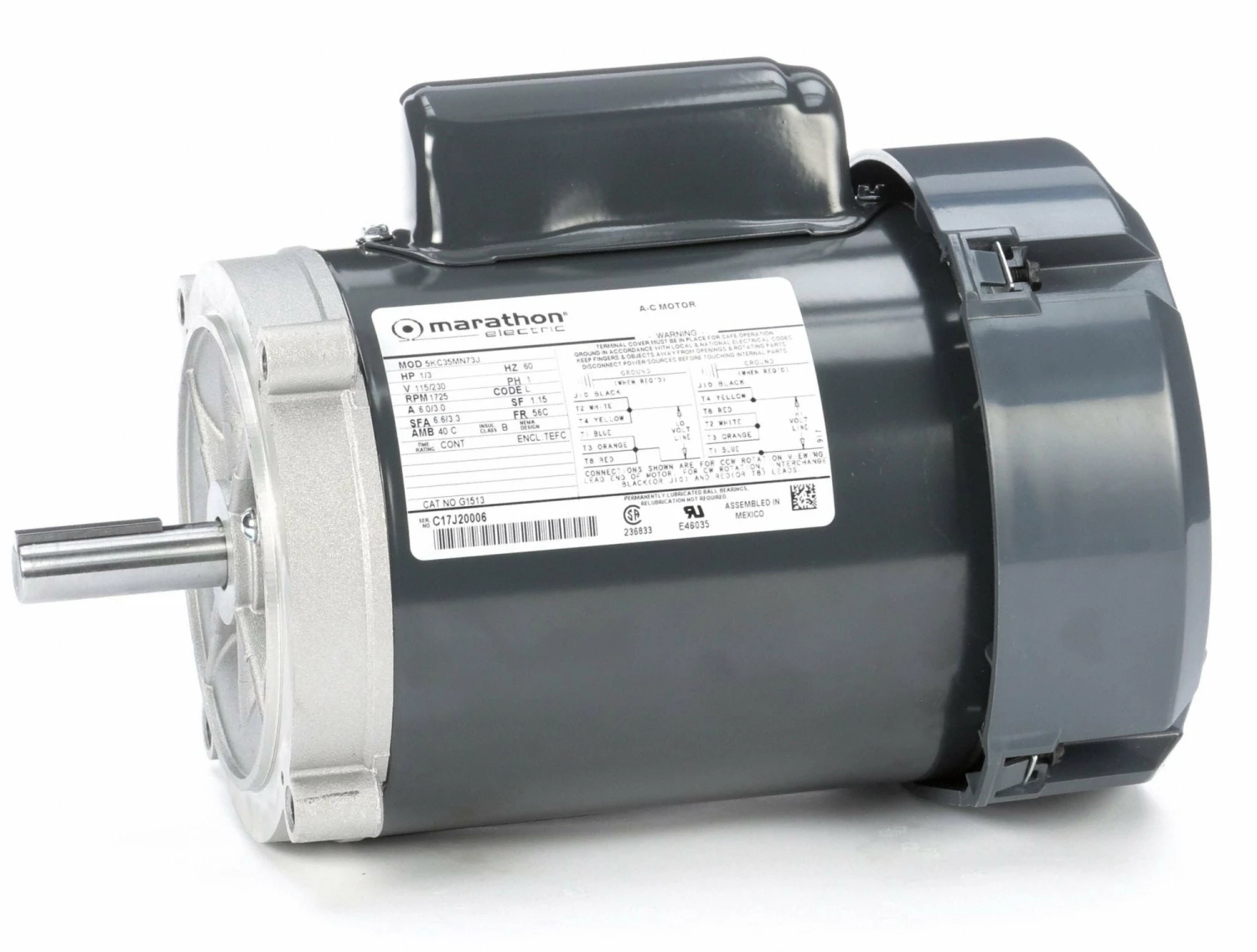 Marathon Motors 1/3 HP, General Purpose Motor, Capacitor-Start, 1725 Nameplate RPM, 115/230 Voltage, 56C Frame – 5KC35MN73