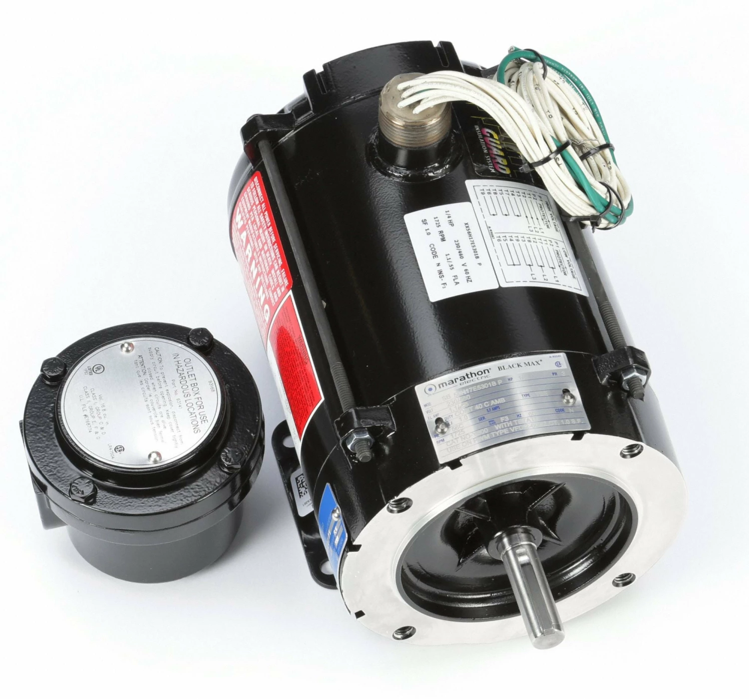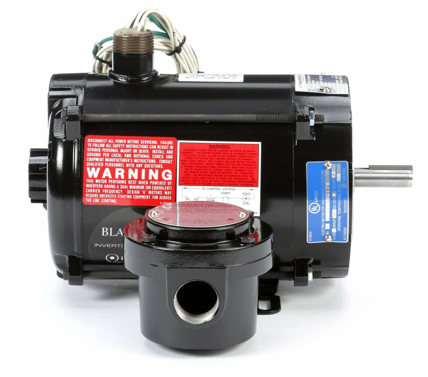 Black Max 3-Phase Hazardous-Location Vector Motors,Enclosure: totally-enclosed nonventilated Service factor: 1.0 Insulation: Class F3 Temp. code: T3B Max. ambient: 40C Max. Operating Frequency: 120 Hz Bearings: ball Rotation: CW/CCW Duty: continuous,Feature constant torque operation from 0 to base speed on vector drive and constant HP operation to twice base rpm. For use in crane, conveyor, hoist, machine tools, material handling, and other variable-speed applications.,Meet Class I and II (gases and dust); Groups C, D, F, and G standards. UL Listed and CSA Certified.