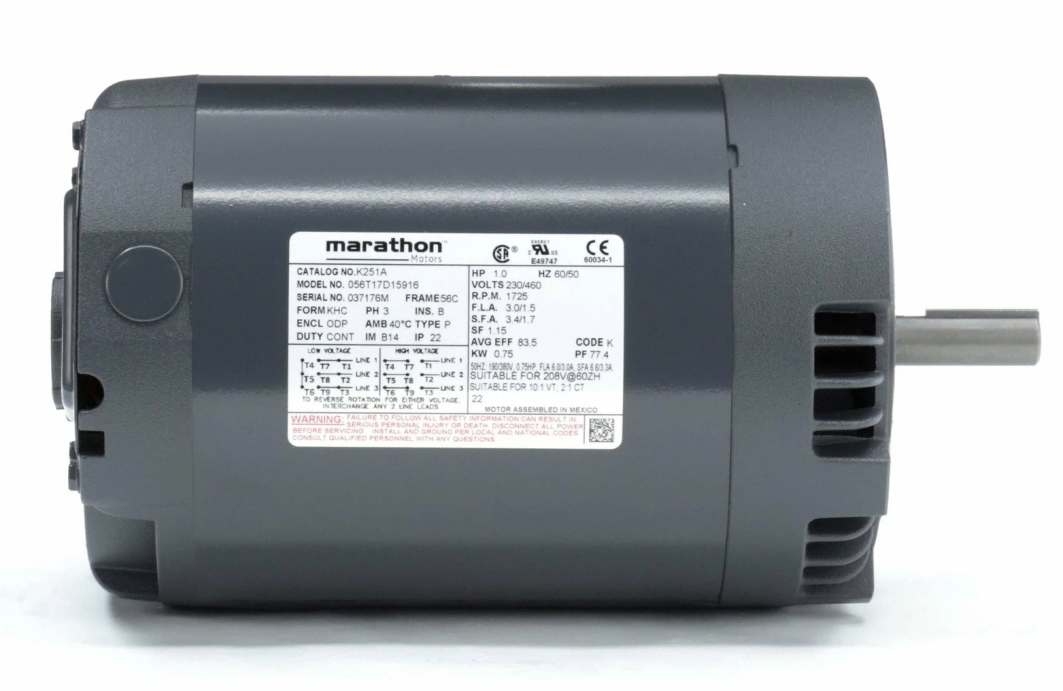 Marathon Motors 1 HP, General Purpose Motor, 3-Phase, 1725 Nameplate RPM, 230/460 Voltage, 56C Frame – 056T17D15916