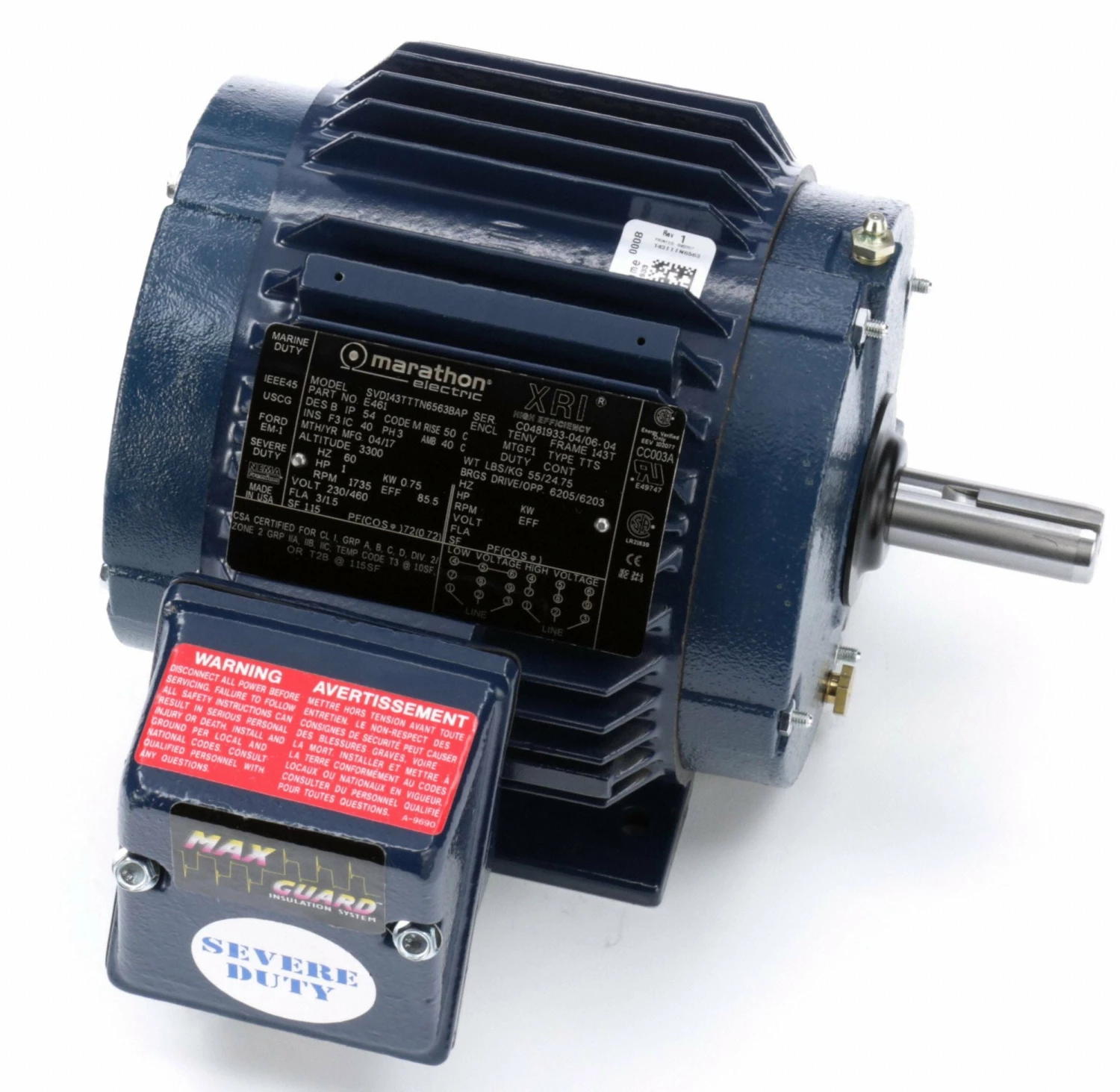 Marathon Motors 1 HP, Severe Duty Motor, 3-Phase, 1735 Nameplate RPM, 230/460 Voltage, 143T Frame – 143TTTN6563