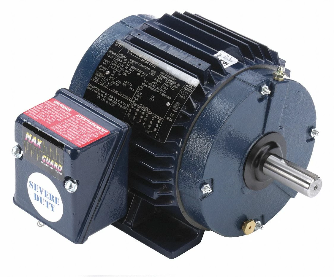 Keep equipment moving in hazardous locations with this severe duty motor. Its 3-phase motor design offers high starting torque, and is suitable for use in industrial environments where 3-phase power is available. It also features a totally enclosed nonventilated enclosure design, which helps resist contamination by preventing air from moving freely between the inside and outside of the frame. The design helps protect the motor from dampness and airborne particles. It resists overheating by radiating excess heat through its finned body design. The cast iron frame offers excellent resistance to wear and holds its shape after impact.