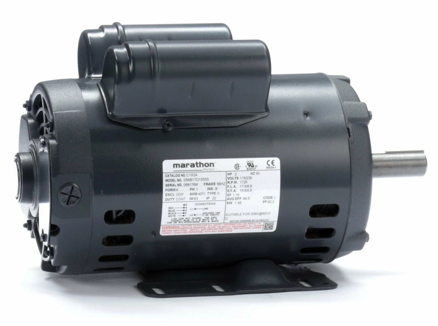 Marathon Motors 2 HP, General Purpose Motor, Capacitor-Start/Run, 1725 Nameplate RPM, 115/230 Voltage – 056B17D15555